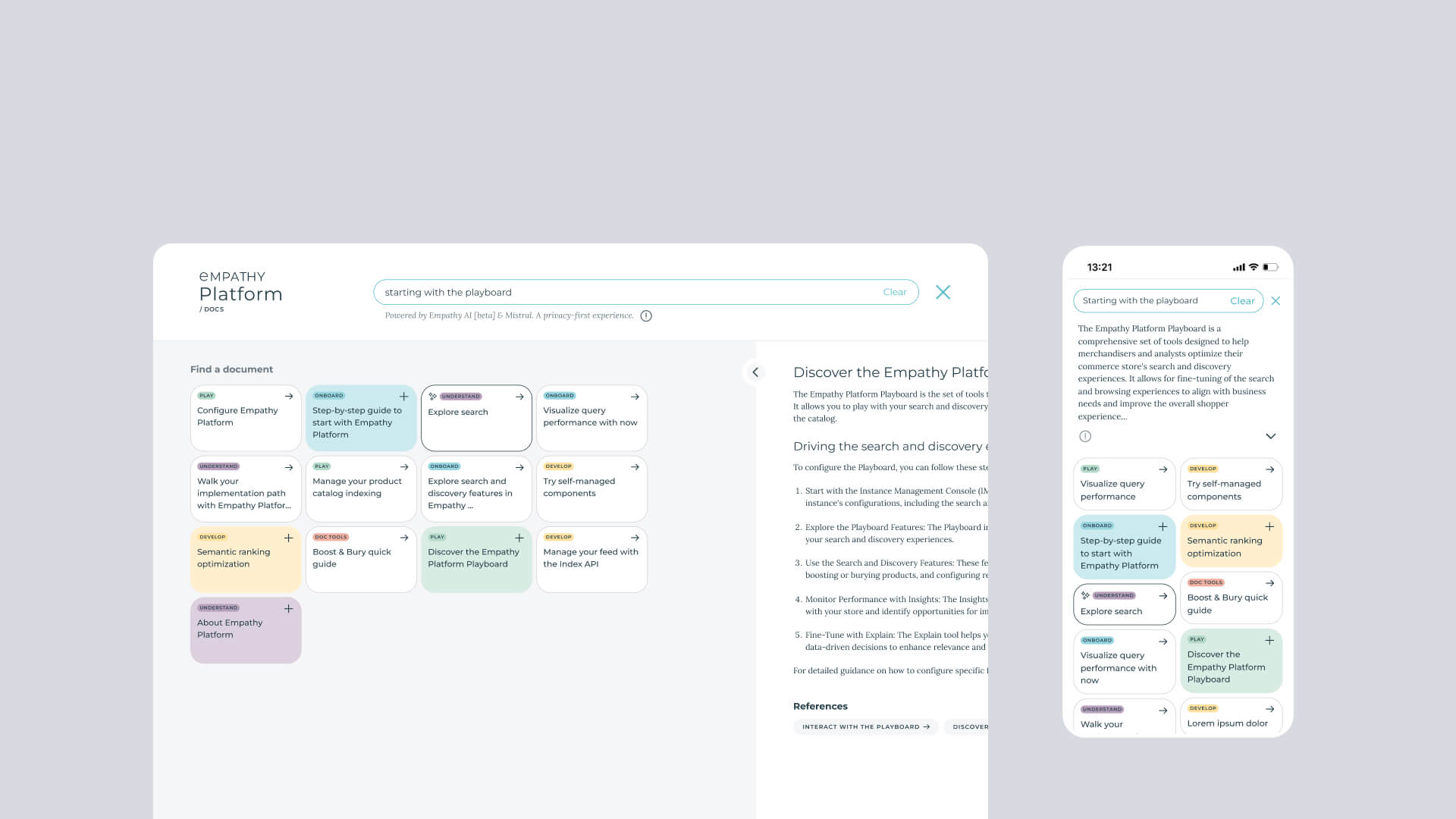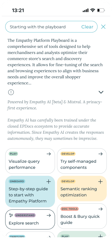 The goal was simple: let users get quick, relevant insights while maintaining access to the depth of structured documentation. We designed a Hybrid Search experience that combines AI-generated responses with a traditional document-based view, allowing users to get quick contextual answers while keeping access to detailed, structured content while staying faithful to its privacy-by-design principles.